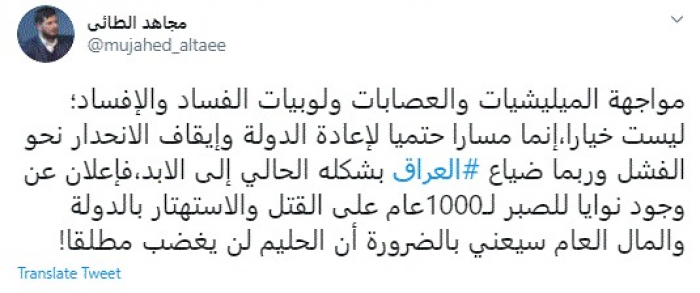 طالب الباحث السياسي العراقي مجاهد الطائي، اليوم، بمواجهة المليشيات ولوبيات الفساد في العراق.
