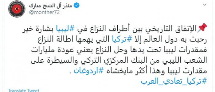 وكتب في تغريدة عبر "تويتر" رصدها "المشهد العربي": "الاتفاق التاريخي بين أطراف النزاع في ليإبيا بشارة خير رحبت به دول العالم إلا تركيا التي يهمها إطالة النزاع فمقدرات ليبيا تحت يدها وحل النزاع يعني عودة مليارات الشعب الليبي من البنك المركزي التركي والسيطرة على مقدارت ليبيا وهذا أكثر ما يخشاه أردوغان".