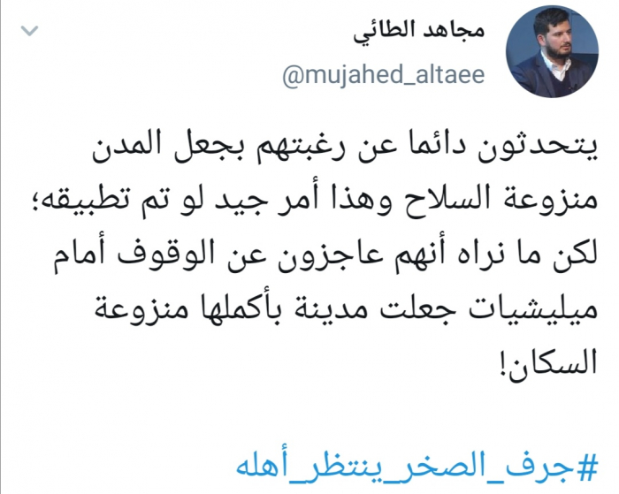 وقال الطائي في تغريدة له عبر حسابه بتويتر ورصدها "المشهد العربي" : "يتحدثون دائما عن رغبتهم بجعل المدن منزوعة السلاح وهذا أمر جيد لو تم تطبيقه؛ لكن ما نراه أنهم عاجزون عن الوقوف أمام ميليشيات جعلت مدينة بأكملها منزوعة السكان".