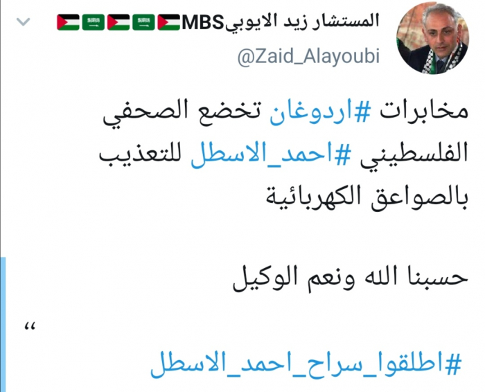 وقال الأيوبي عبر تغريدة له على "تويتر" رصدها " المشهد العربي" مخابرات أردوغان تخضع الصحفي الفلسطيني أحمد الأسطل للتعذيب بالصواعق الكهربائية ".