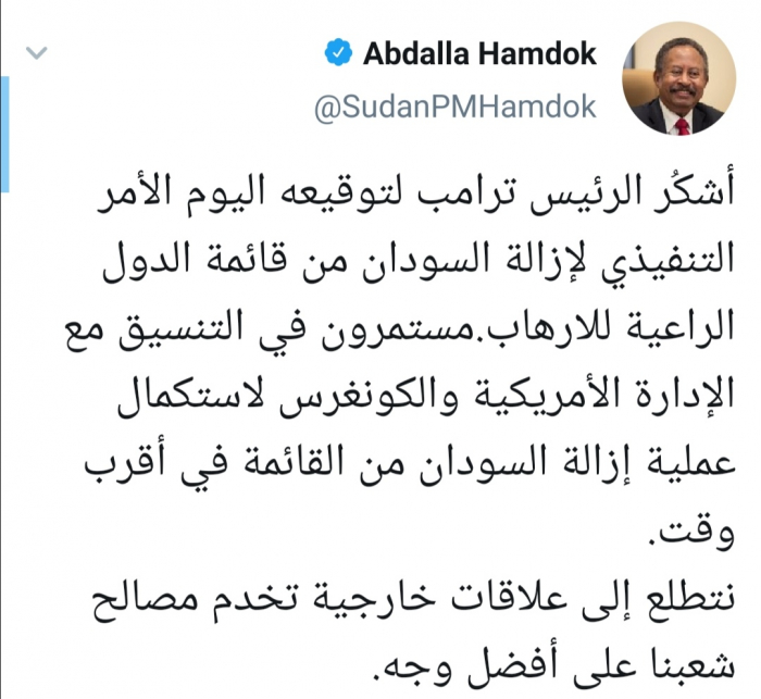 وجه رئيس الوزراء السوداني، عبد الله حمدوك، رسالة شكر للرئيس الأمريكي دونالد ترامب بعد إزالة اسم السودان من قائمة الدول الراعية للإرهاب.