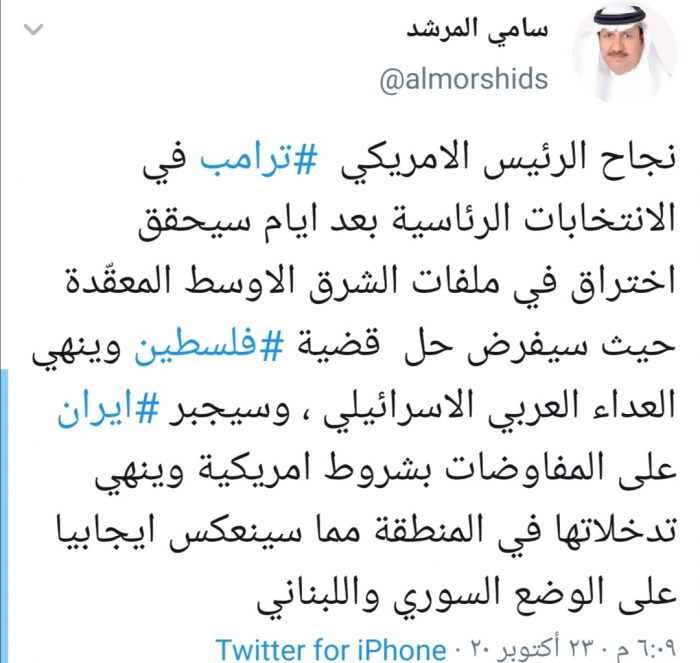 وأوضح المرشد في تغريدة له عبر حسابه بتويتر ورصدها "المشهد العربي" أن ترامب "سيفرض حل قضية فلسطين وينهي العداء العربي الإسرائيلي، وسيجبر إيران على المفاوضات بشروط أمريكية وينهي تدخلاتها في المنطقة مما سينعكس إيجابياً على الوضع السوري واللبناني".
