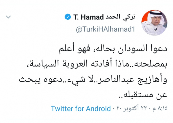 وقال الحمد في تغريدة له عبر حسابه بتويتر ورصدها "المشهد العربي": " دعوا السودان بحاله، فهو أعلم بمصلحته..ماذا أفادته العروبة السياسة، وأهازيج عبدالناصر..لا شيء..دعوه يبحث عن مستقبله".