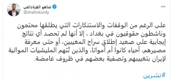 وقال في تغريدة عبر "تويتر" رصدها "المشهد العربي": "على الرغم من الوقفات والاستنكارات التي يطلقها محتجون وناشطون حقوقيون في بغداد، إلا أنها لم تحصد أي نتائج إيجابية على صعيد إطلاق سراح المغيبين، أو حتى معرفة مصيرهم، أحياء كانوا أم أمواتا، والذين تُتهم المليشيات الموالية لإيران بتغييبهم وتصفية بعضهم في ظروف غامضة".