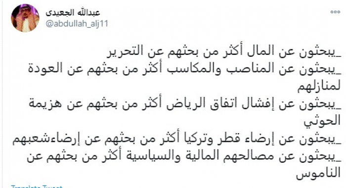 وقال في تغريدة عبر "تويتر" رصدها "المشهد العربي": "يبحثون عن المال أكثر من بحثهم عن التحرير والمناصب والمكاسب أكثر من بحثهم عن العودة لمنازلهم".