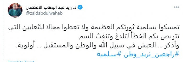 وقال في تغريدة عبر "تويتر" رصدها "المشهد العربي": "تمسكوا بسلمية ثورتكم العظيمة ولا تعطوا مجالًا للثعابين التي تتربص بكم الخطأ لتلدغ وتنفث السم. واُذكر ... العيش في سبيل الله والوطن والمستقبل ... أولوية".
