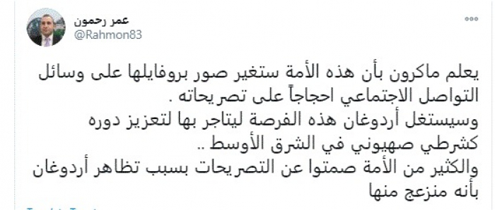 وكتب في تغريدة عبر "تويتر" رصدها "المشهد العربي": "يعلم ماكرون بأن هذه الأمة ستغير صور بروفايلها على وسائل التواصل الاجتماعي احتجاجاً على تصريحاته. وسيستغل أردوغان هذه الفرصة ليتاجر بها لتعزيز دوره كشرطي صهيوني في الشرق الأوسط.. والكثير من الأمة صمتوا عن التصريحات بسبب تظاهر أردوغان بأنه منزعج منها".