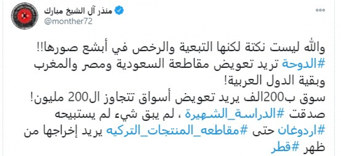 علق المدون السعودي البارز منذر آل الشيخ مبارك، اليوم، على محاولات قطر لتعويض خسارة تركيا جراء مقاطعة الشعب السعودي للمنتجات التركية.