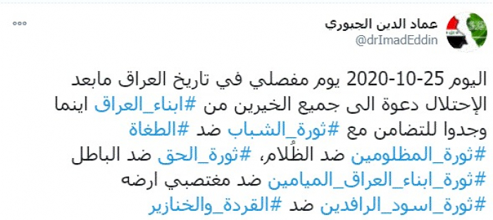 وقال في تغريدة عبر "تويتر" رصدها "المشهد العربي": "اليوم 25-10-2020 يوم مفصلي في تاريخ العراق ما بعد الاحتلال دعوة إلى جميع الخيرين من أبناء العراق أينما وجدوا للتضامن مع ثورة الشباب ضد الطغاة ثورة المظلومين ضد الظُلام".