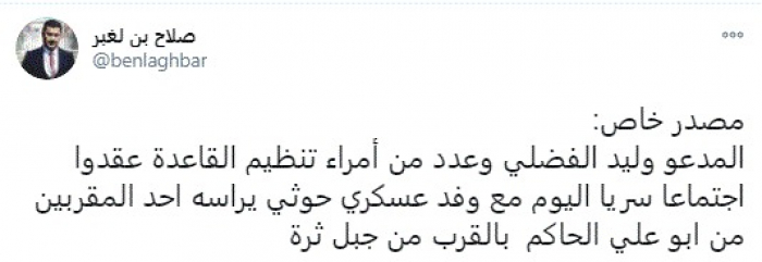 وقال في تغريدة عبر "تويتر" رصدها "المشهد العربي": "مصدر خاص: المدعو وليد الفضلي وعدد من أمراء تنظيم القاعدة عقدوا اجتماعًأ سريًا اليوم مع وفد عسكري حوثي يرأسه أحد المقربين من أبو علي الحاكم بالقرب من جبل ثرة".