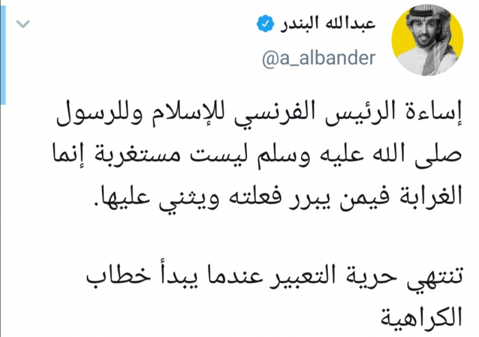 وقال البندر في تغريدة له عبر حسابه بتويتر ورصدها "المشهد العربي": "إساءة الرئيس الفرنسي للإسلام وللرسول صلى الله عليه وسلم ليست مستغربة إنما الغرابة فيمن يبرر فعلته ويثني عليها".