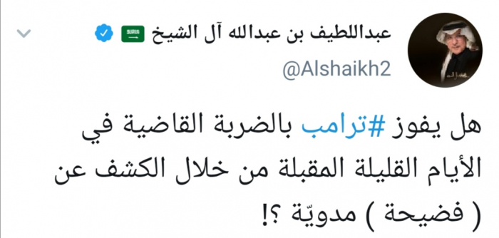 وكتب "أل شيخ" تغريدة عبر تويتر، رصدها "المشهد العربي" يقول: "هل يفوز ترامب بالضربة القاضية في الأيام القليلة المقبلة من خلال الكشف عن ( فضيحة ) مدويّة؟!".