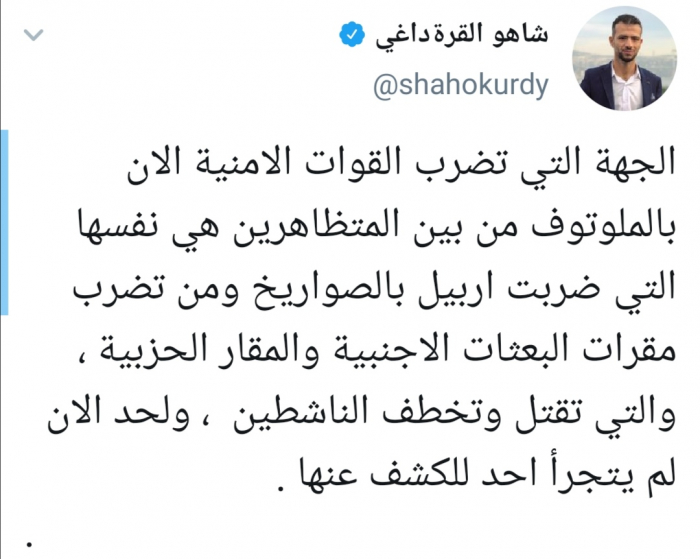 قال الكاتب الصحفي العراقي شاهو القرة داغي، إن الجهة التي تضرب القوات الأمنية الآن بالملوتوف من بين المتظاهرين هي نفسها التي ضربت أربيل بالصواريخ.