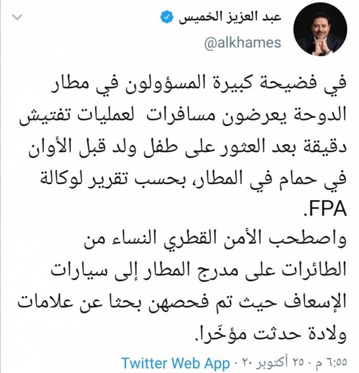 وقال الخميس في تغريدة عبر حسابه بتويتر ورصدها "المشهد العربي" : "في فضيحة كبيرة المسؤولون في مطار الدوحة يعرضون مسافرات لعمليات تفتيش دقيقة بعد العثور على طفل ولد قبل الأوان في حمام في المطار، بحسب تقرير لوكالة FPA".