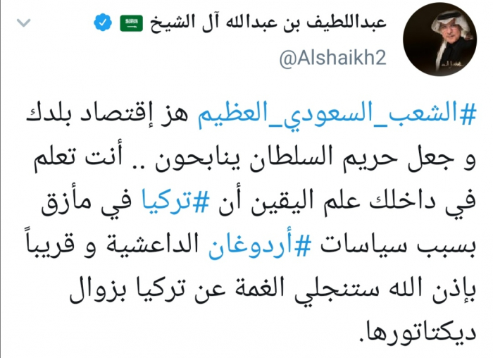 وكتب "أل شيخ" تغريدة عبر تويتر، رصدها "المشهد العربي" يقول: "الشعب السعودي العظيم هز إقتصاد بلدك و جعل حريم السلطان ينابحون، أنت تعلم في داخلك علم اليقين أن تركيا في مأزق بسبب سياسات أردوغان الداعشية و قريباً بإذن الله ستنجلي الغمة عن تركيا بزوال ديكتاتورها".