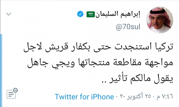 وكتب السليمان عبر تغريدة له على "تويتر" رصدها " المشهد العربي":"تركيا استنجدت حتى بكفار قريش لأجل مواجهة مقاطعة منتجاتها ويجي جاهل يقول مالكم تأثير".