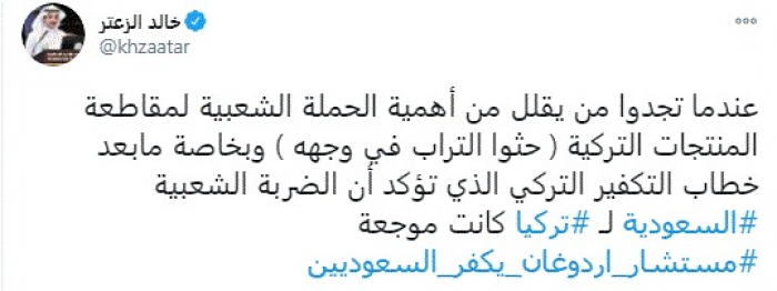 وكتب في تغريدة عبر "تويتر" رصدها "المشهد العربي": "عندما تجدوا من يقلل من أهمية الحملة الشعبية لمقاطعة المنتجات التركية (حثوا التراب في وجهه) وبخاصة ما بعد خطاب التكفير التركي الذي تؤكد أن الضربة الشعبية السعودية لتركيا كانت موجعة".
