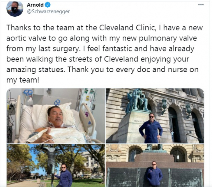 ونشر بطل أفلام الأكشن، صور عبر موقع "تويتر"، وقال أنها العملية الثانية له، بعد أن خضع للأولى منذ عامين"، وقال "أرنولد" أيضا، أنه في حالة جيدة، ووجه الشكر للطاقم الطبي بالمستشفى.
