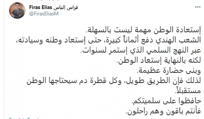 وكتب في تغريدة عبر "تويتر" رصدها "المشهد العربي": "استعادة الوطن مهمة ليست بالسهلة. الشعب الهندي دفع أثماناً كبيرة، حتى إستعاد وطنه وسيادته، عبر النهج السلمي الذي استمر لسنوات. لكنه بالنهاية إستعاد الوطن. وبنى حضارة عظيمة".