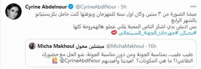 الصور تم تداولها لمقارنة إطلالة النجمة اللبنانية بأزياء نجمات المهرجان، إلا أنها علّقت وكشفت مفاجأة قائلةً: "الصور من 3 سنين وكانت أول سنة للمهرجان، وبوقتها كنت حامل بـ(كريستيانو) بالشهر الرابع، بس أديش بدي أشكر الناس المحبة يللي عملوا ها الهمروجة كلها".