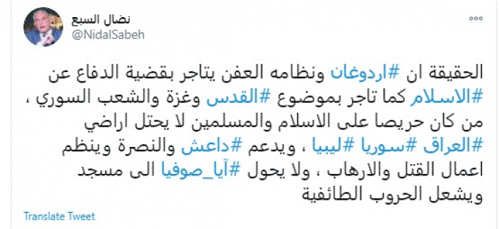 انتقد المحلل السياسي اللبناني نضال السبع، اليوم، الرئيس التركي رجب طيب أردوغان، جراء متاجرته بقضية الدفاع عن الإسلام.