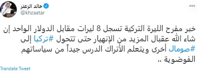 وقال في تغريدة عبر "تويتر" رصدها "المشهد العربي": "خبر مفرح الليرة التركية تسجل 8 ليرات مقابل الدولار الواحد إن شاء الله عقبال المزيد من الانهيار حتى تتحول تركيا إلى صومال أخرى ويتعلم الأتراك الدرس جيداً من سياساتهم الفوضوية".
