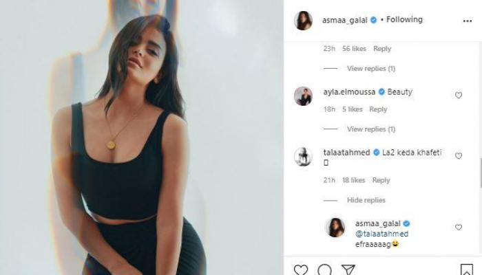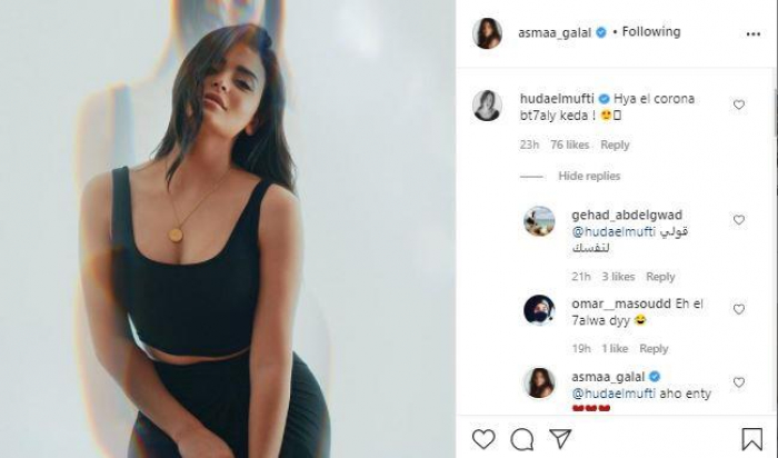 التعليقات التي تلقتها أسماء جلال أيضا على الصورة أشارت إلى ذلك، إذ كتبت لها الفنانة هدى المفتي: "هي الكورونا بتحلي كده؟"، وعلّق لها الفنان طلعت أحمد قائلا: "كده يبقى خفيتي"، فعقبت: "إفراج".