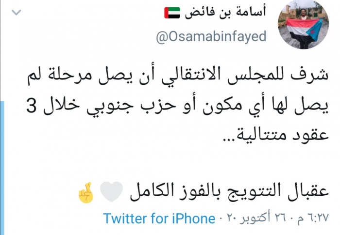 وكتب بن فائض في تغريدة له عبر حسابه بتويتر ورصدها المشهد العربي يقول : "شرف للمجلس الانتقالي أن يصل مرحلة لم يصل لها أي مكون أو حزب جنوبي خلال 3 عقود متتالية".