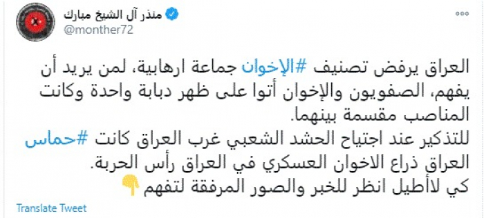 حذر المدون السعودي البارز منذر آل الشيخ مبارك، اليوم، من خطورة رفض العراق لتصنيف جماعة الإخوان بالبلاد كجماعة إرهابية.