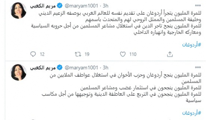 قالت الكاتبة والإعلامية الإماراتية مريم الكعبي، اليوم، إن الرئيس التركي رجب طيب أردوغان وجماعة الإخوان نجحوا في استثمار غضب ومشاعر المسلمين خلال أزمة الرئيس الفرنسي مانويل ماكرون.