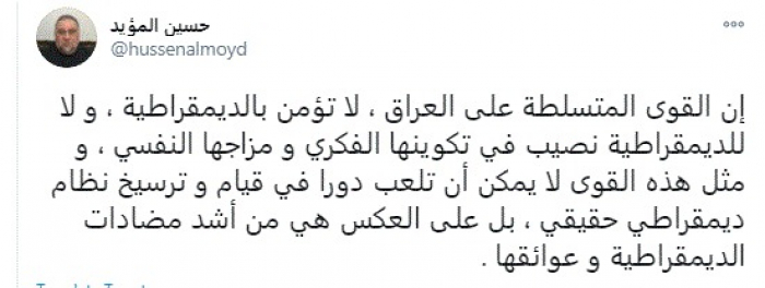 وقال في تغريدة عبر "تويتر" رصدها "المشهد العربي": "إن القوى المتسلطة على العراق، لا تؤمن بالديمقراطية، ولا للديمقراطية نصيب في تكوينها الفكري ومزاجها النفسي، ومثل هذه القوى لا يمكن أن تلعب دورا في قيام وترسيخ نظام ديمقراطي حقيقي، بل على العكس هي من أشد مضادات الديمقراطية وعوائقها".