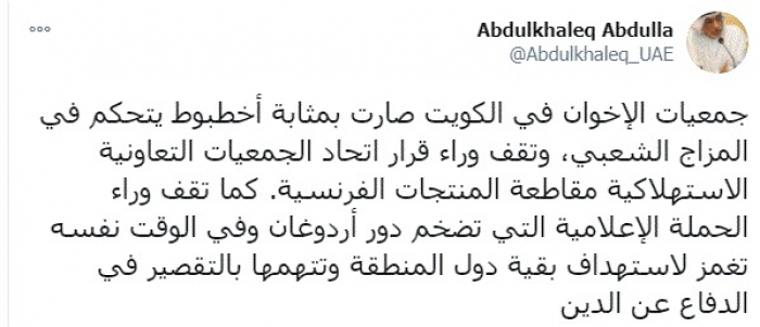 وقال في تغريدة عبر "تويتر" رصدها "المشهد العربي": "جمعيات الإخوان في الكويت صارت بمثابة أخطبوط يتحكم في المزاج الشعبي، وتقف وراء قرار اتحاد الجمعيات التعاونية الاستهلاكية مقاطعة المنتجات الفرنسية".