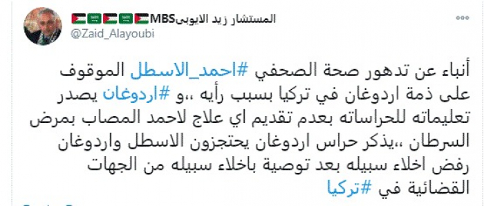 وقال في تغريدة عبر "تويتر" رصدها "المشهد العربي": "أنباء عن تدهور صحة الصحفي أحمد الأسطل الموقوف على ذمة أردوغان في تركيا بسبب رأيه،، وأردوغان يصدر تعليماته للحراساته بعدم تقديم أي علاج لأحمد المصاب بمرض السرطان،، يذكر أن حراس أردوغان يحتجزون الأسطل وأردوغان رفض إخلاء سبيله بعد توصية بإخلاء سبيله من الجهات القضائية في تركيا".
