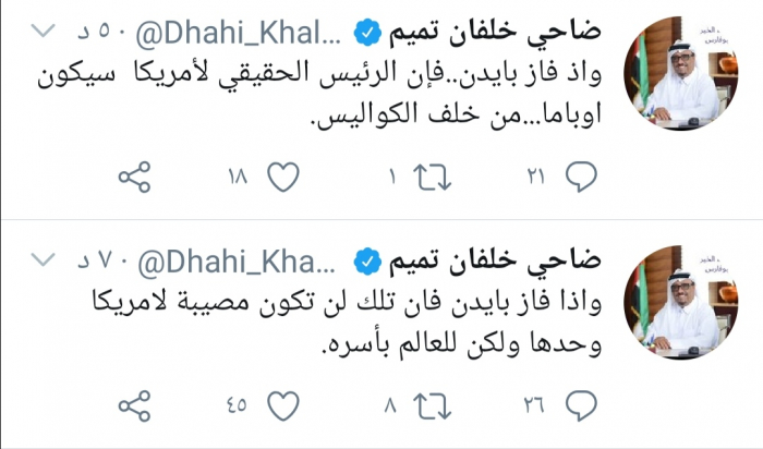 وقال خلفان في تغريدة له عبر حسابه بتويتر ورصدها "المشهد العربي": "وإذا فاز بايدن فإن الرئيس الحقيقي لأمريكا سيكون أوباما من خلف الكواليس".