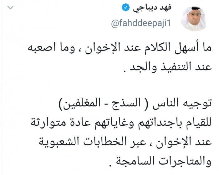 وقال ديباجي تغريدة له عبر حسابه في تويتر ورصدها "المشهد العربي": "ما أسهل الكلام عند الإخوان، وما أصعبه عند التنفيذ والجد".