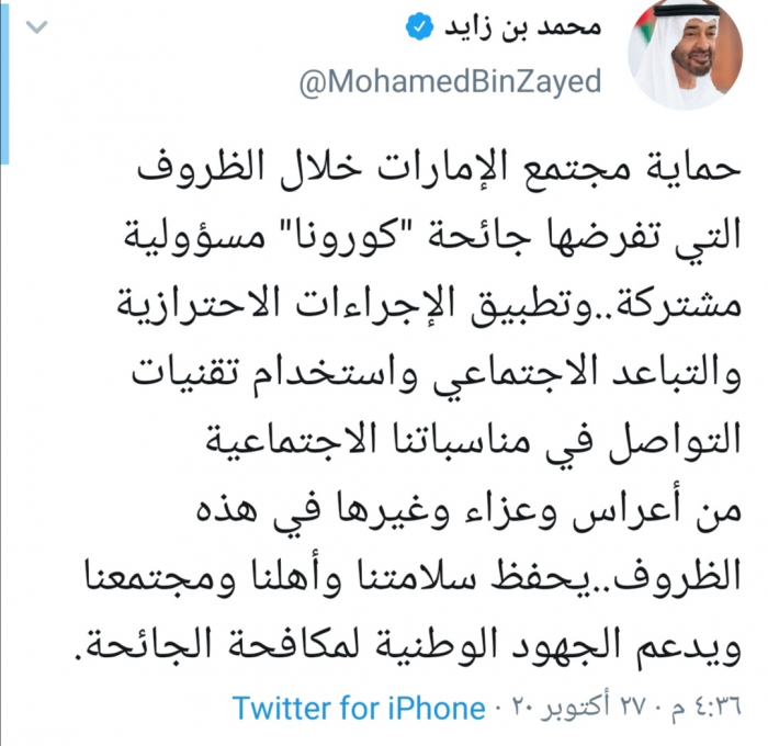 أكد ولي عهد أبوظبي نائب القائد الأعلى للقوات المسلحة الإماراتية الشيخ محمد بن زايد آل نهيان، أن حماية مجتمع الإمارات خلال الظروف التي تفرضها جائحة "كورونا" مسؤولية مشتركة.