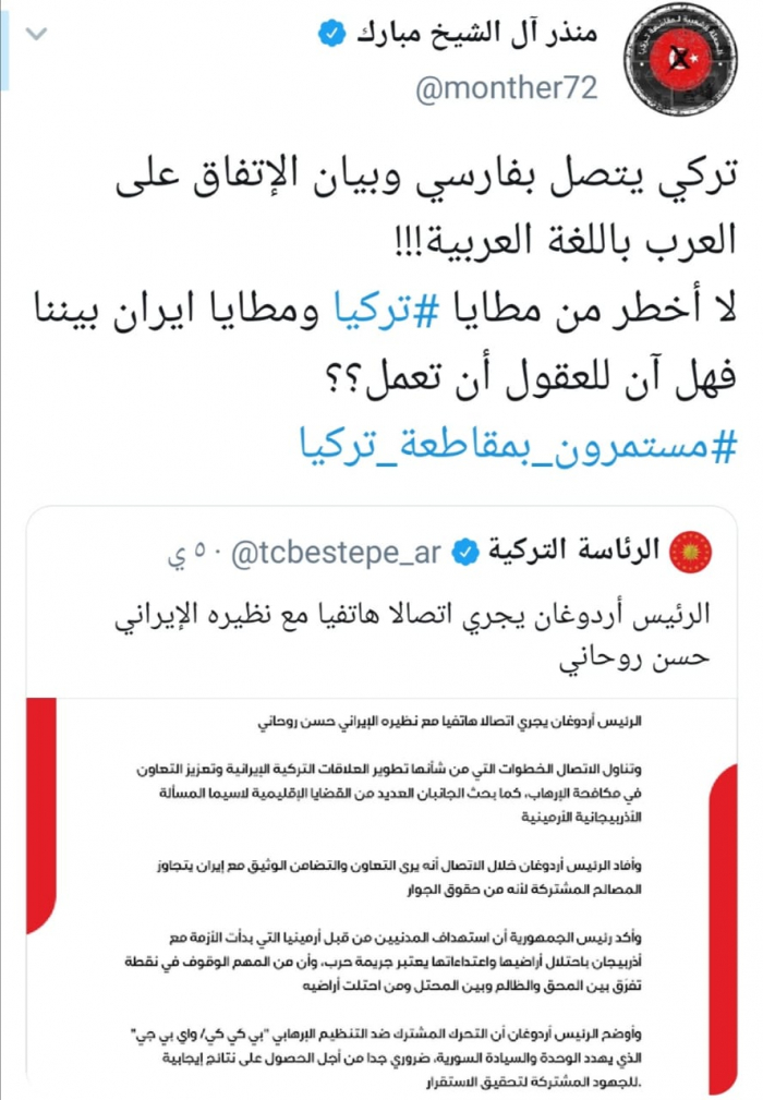 ونشر آل شيخ المبارك عبر تغريدة له على "تويتر" رصدها " المشهد العربي" بيان مشترك بين تركيا وإيران وعلق قائلا:"تركي يتصل بفارسي وبيان الإتفاق على العرب باللغة العربية".