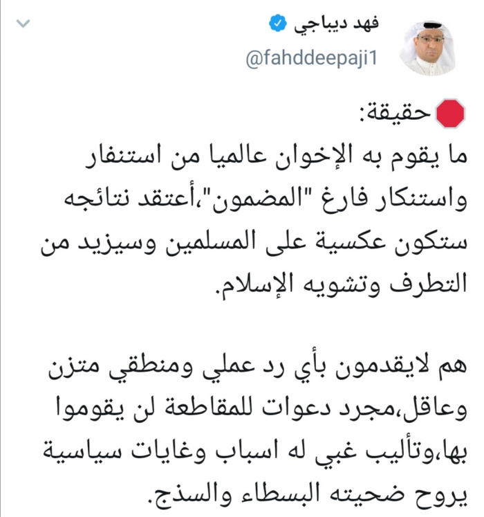 وغرد ديباجي عبر حسابه في تويتر ورصدها "المشهد العربي" قائلاً: "حقيقة: ما يقوم به الإخوان عالميا من استنفار واستنكار فارغ "المضمون"، أعتقد نتائجه ستكون عكسية على المسلمين وسيزيد من التطرف وتشويه الإسلام".