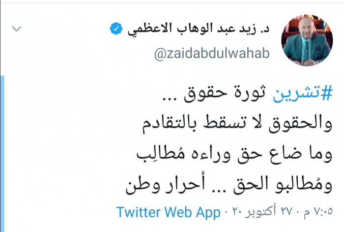 أكد الإعلامي العراقي الدكتور زيد عبدالوهاب الأعظمي ، أن ثورة "تشرين" في العراق هي ثورة حقوق والحقوق لا تسقط بالتقادم.