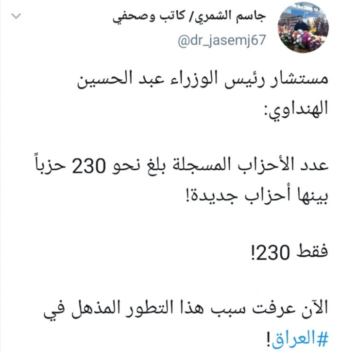 وقال الشمري في تغريدة له عبر حسابه بتويتر ورصدها "المشهد العربي" : "مستشار رئيس الوزراء عبد الحسين الهنداوي: عدد الأحزاب المسجلة بلغ نحو 230 حزباً بينها أحزاب جديدة".