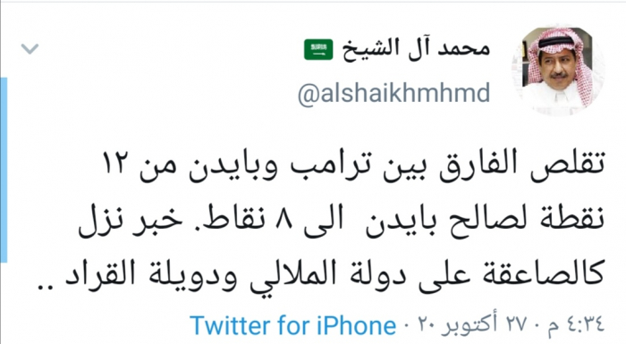 وكتب آل الشيخ في تغريدة له عبر "تويتر" رصدها "المشهد العربي": "تقلص الفارق بين ترامب وبايدن من 12 نقطة لصالح بايدن إلى 8 نقاط. خبر نزل كالصاعقة على دولة الملالي ودويلة القراد".