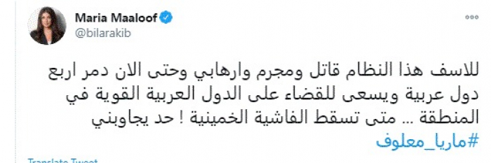 انتقدت الإعلامية اللبنانية ماريا معلوف، اليوم، النظام الإيراني، مؤكدةً أنه يسعى للقضاء على الدول العربية القوية في المنطقة.