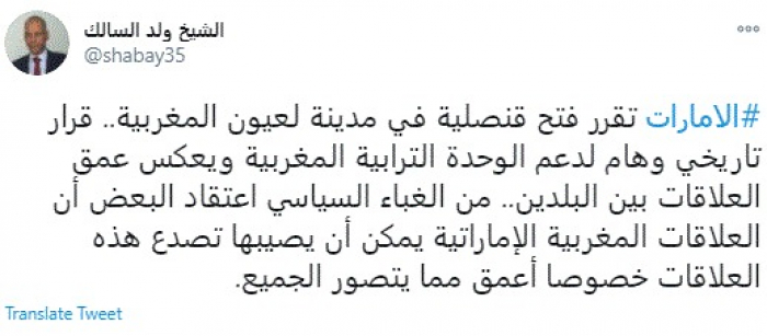 وكتب في تغريدة عبر "تويتر" رصدها "المشهد العربي": "الإمارات تقرر فتح قنصلية في مدينة لعيون المغربية.. قرار تاريخي وهام لدعم الوحدة الترابية المغربية ويعكس عمق العلاقات بين البلدين".