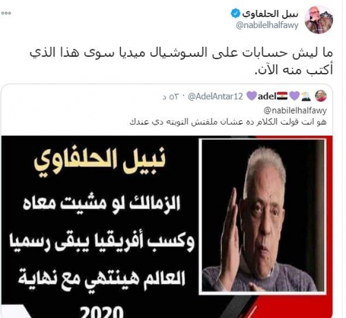 علق الفنان نبيل الحلفاوي على هذه التغريدة قائلًا، :"ماليش حسابات على السوشيال ميديا سوى هذا الذي أكتب منه الآن".