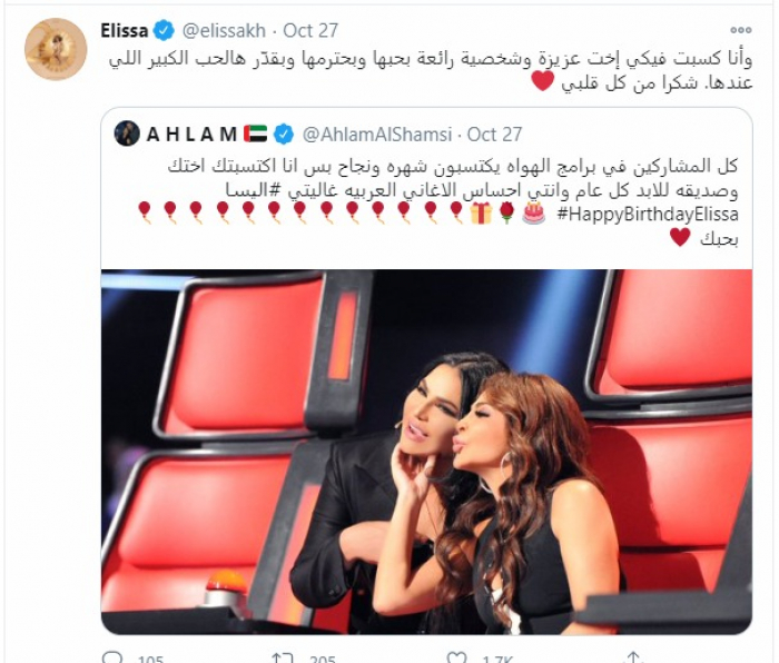ومن جانبها حرصت إليسا على الرد في تغريدة أخرى قالت فيها: "وأنا كسبت فيكي أخت عزيزة وشخصية رائعة بحبها وبحترمها وبقدر هالحب الكبير اللي عندها.. شكرا من كل قلبي".
