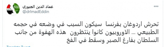 وكتب في تغريدة عبر "تويتر" رصدها "المشهد العربي": "تحرش أردوغان بفرنسا سيكون السبب في وضعه في حجمه الطبيعي... الأوروبيون كانوا ينتظرون هذه الهفوة من جانب السلطان بفارغ الصبر وسقط في الفخ".