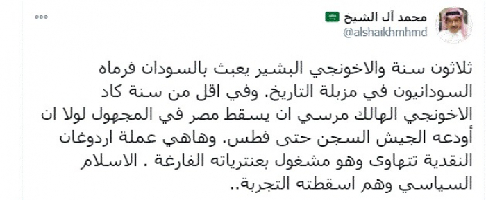 وقال في تغريدة عبر "تويتر" رصدها "المشهد العربي": "ثلاثون سنة والاخونجي البشير يعبث بالسودان فرماه السودانيون في مزبلة التاريخ. وفي أقل من سنة كاد الإخونجي مرسي أن يسقط مصر في المجهول لولا أن أودعه الجيش السجن حتى.... وها هي عملة أردوغان النقدية تتهاوى وهو مشغول بعنترياته الفارغة. الإسلام السياسي وهم أسقطته التجربة".