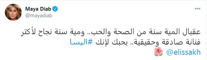 وكتبت "دياب" تغريدة، عبر حسابها الرسمي بموقع "تويتر"، قالت فيها: "عقبال المية سنة من الصحة والحب، ومية سنة نجاح لأكتر فنانة صادقة وحقيقية، بحبك لإنك إليسا".