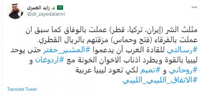طالب الخبير الأمني السعودي اللواء ركن الدكتور زايد العمري، اليوم، القادة العرب بدعم قائد الجيش الوطني الليبي المشير خليفة حفتر لتحرير ليبيا من عملاء دول الشر.