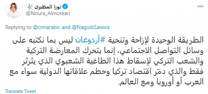 وقالت في تغريدة عبر "تويتر" رصدها "المشهد العربي": "الطريقة الوحيدة لإزاحة وتنحية أردوغان ليس بما نكتبه على وسائل التواصل الاجتماعي، إنما بتحرك المعارضة التركية والشعب التركي لإسقاط هذا الطاغية الشعبوي الذي يثرثر فقط والذي دمّر اقتصاد تركيا وحطم علاقاتها الدولية سواء مع العرب أو أوروبا ومع العالم".